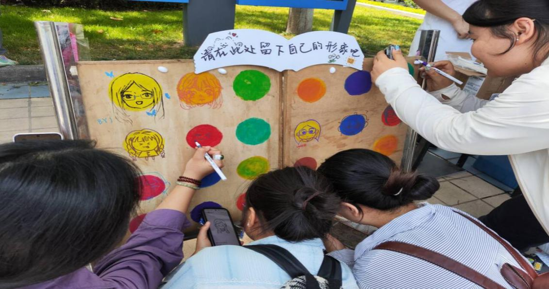 共绘笑脸墙活动前,同学们用五彩画笔描绘着心中的快乐。有人画下灿烂的向日葵笑脸,写着“传递快乐”;有人创作俏皮的眨眼表情,配上“加油”的鼓励;还有人绘制戴着耳机的卡通笑脸,展现青春活力。简约的笑脸符号与创意设计相映成趣,或色彩鲜明,或构图温馨,这些生动的笑脸不仅展现了同学们的创意,更传递出积极的生活态度。
