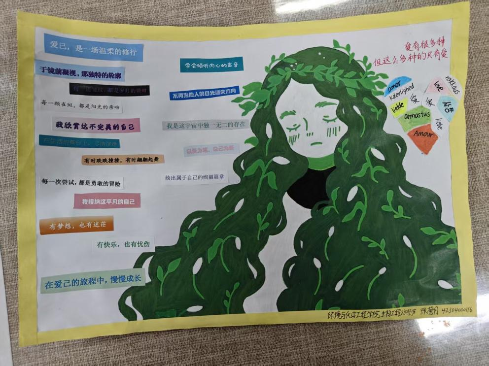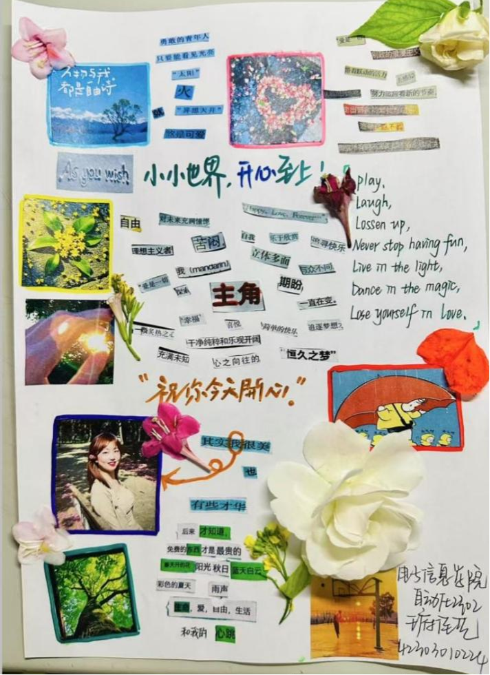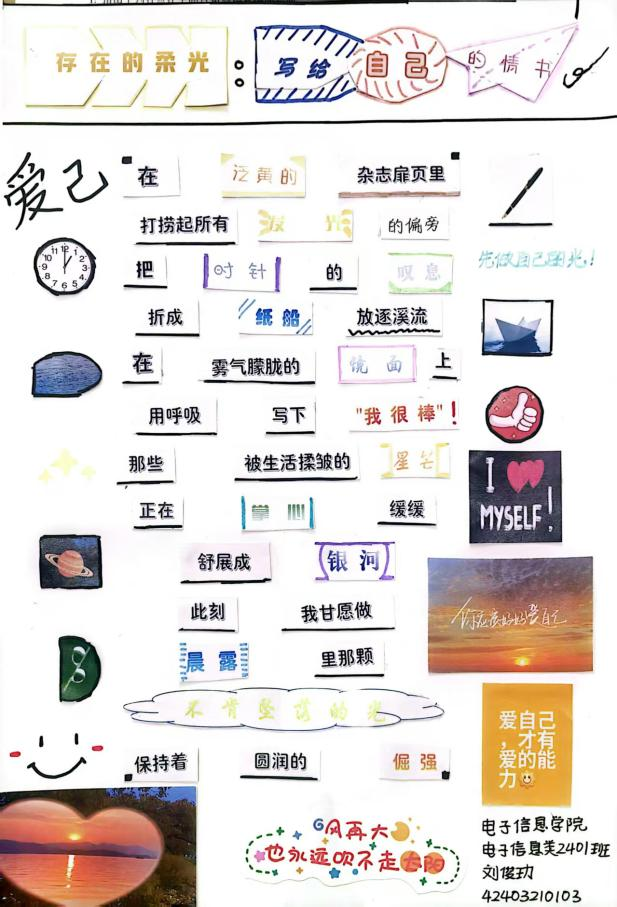 在“以爱为名”心理拼贴诗活动中,参与者从旧杂志、书籍中裁剪词句与图案,拼贴成传递“自我关爱”主题的诗歌。同学们用创意和心灵碰撞出一幅幅动人的作品,有的以细腻文字表达对内在价值的肯定,有的用色彩碰撞展现成长的勇气。经学生自主申报、学院初筛审核、心理中心专家评审等环节,秉持公平、公正、公开的原则,最终评选出一等奖5名,二等奖9名,三等奖12名。