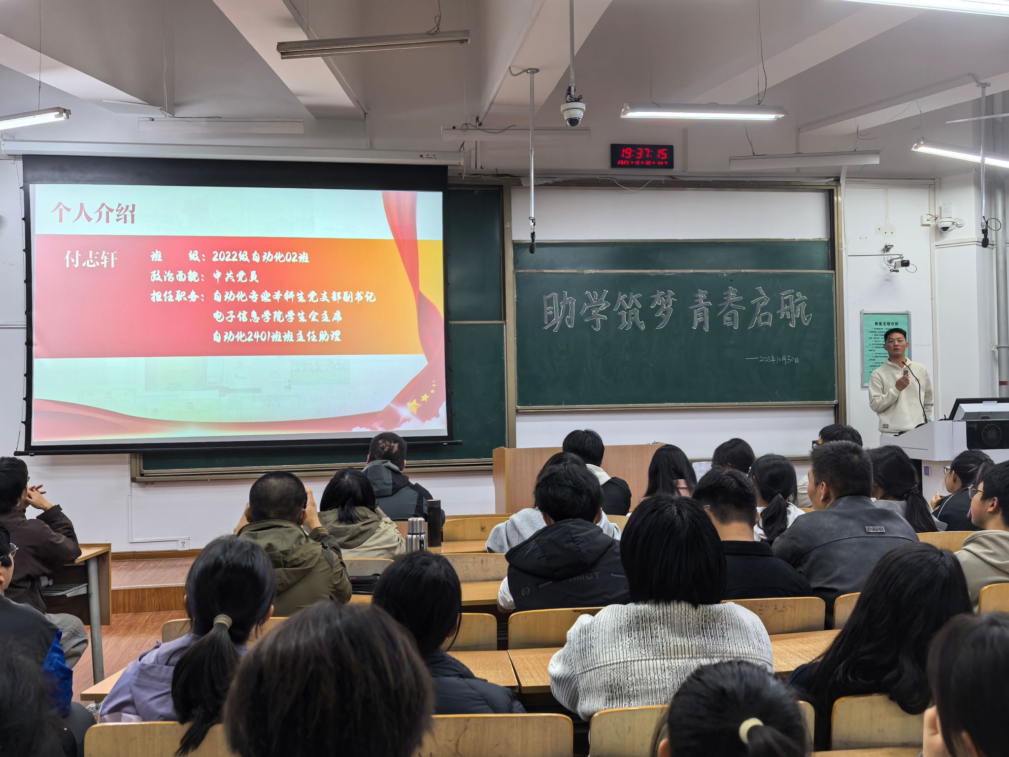 2022级自动化专业付志轩和通信工程专业王治鹏、2023级电子信息工程专业张腾、自动化专业张家豪、人工智能专业王泽睿及电气工程及其自动化专业门学敬等六位国家奖学金获得者精心准备、毫无保留的为新生同学们传经送宝。他们围绕课程学习方法、专业知识积累、时间规划技巧、学科竞赛参与等同学们关注的问题,毫无保留地传授经验做法和亲身感悟。他们的分享中,既有高效复习的实用窍门、平衡学业与课余生活的科学方案,也有面对困难时的心态调整方法、探索专业兴趣的实践路径。生动的案例、真挚的话语让在场同学们深受启发,大家认真聆听、仔细记录,不时用掌声回应学长学姐的真诚分享。