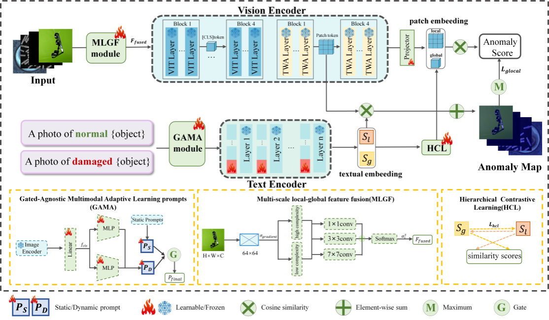 成果简介:工业异常检测是工业生产流程中的关键组成部分。现有的基于深度学习的方法在针对实际工业应用进行训练时,在泛化到未见过的物体类别方面面临重大困难。为弥合这一差距,该研究提出了一种基于CLIP的零样本异常检测(ZSAD)方法SupAD。首先,在视觉编码器中设计了动态窗口划分器(DWP),可根据输入图像的表面复杂度动态调整窗口大小,并结合纹理感知注意力机制以捕捉细粒度的异常特征;其次,提出了一种集成空间梯度适配器的门控无关多模态自适应(GAMA)提示学习模块;最后,引入分层对比学习(HCL)来优化全局和局部提示学习,有效增强模型的跨域泛化能力。实验结果表明,该模型在1个私有数据集和5个公开基准测试上均优于现有ZSAD方法,达到了最先进的性能。更重要的是,该方法为其他基于CLIP的异常检测方法提供了重要启示。